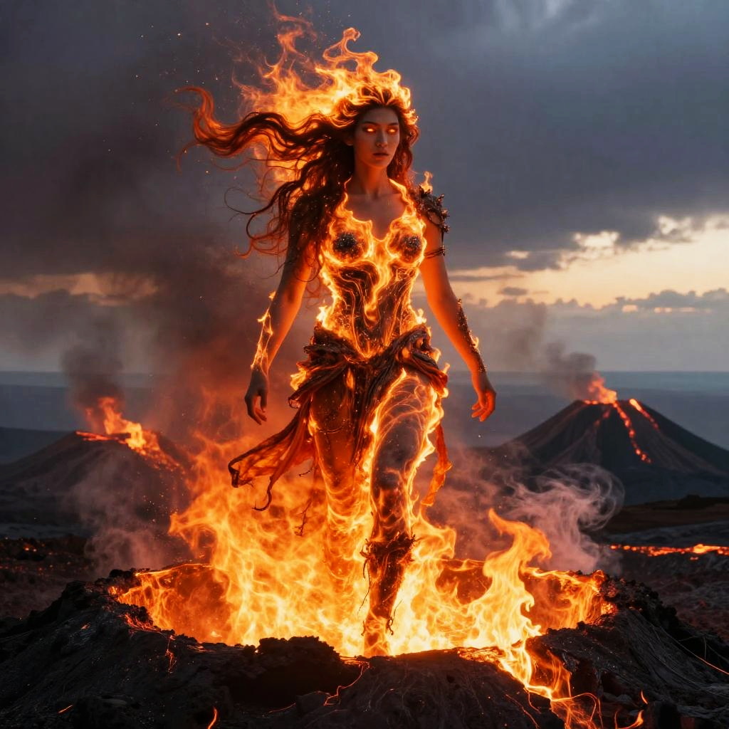 Pele – Goddess of volcanoes and fire, portrayed as a luminous goddess with flowing hair made of sparkling ash and flickering flames, her eyes glowing bright like hot coals, standing in the swirling smoke-filled sky above a freshly formed volcanic island at sunrise.
