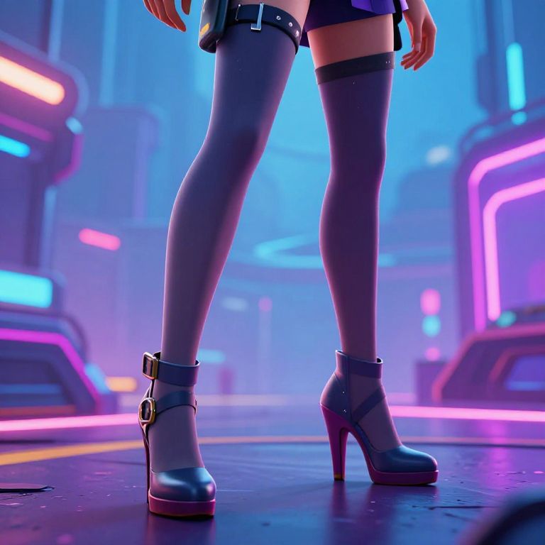 Photorealistic digital CGI of a fit woman with light skin wearing a tight, shiny black one-piece swimsuit. Her toned arms and legs are visible, with her right arm slightly raised. The background features a futuristic, neon-lit setting with blue and pink horizontal light bars. The lighting creates a colorful glow on her swimsuit, highlighting its glossy texture. Her face is not shown, focusing on her athletic build and the sleek outfit. The image emphasizes the contrast between the dark swimsuit and the vibrant, multi-colored background.