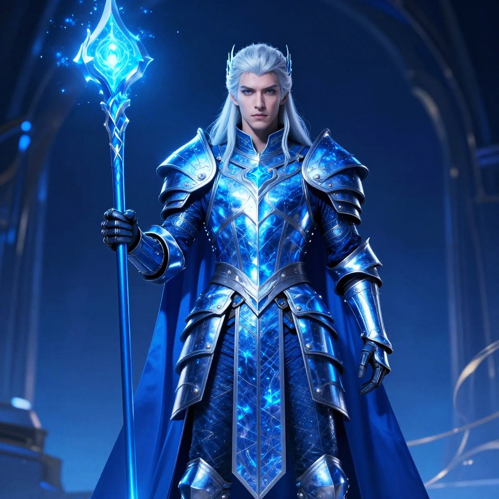 A powerful figure stands at the forefront, clad in a majestic blue armor that reflects a mystical aura. The character holds a luminous staff, suggesting a strong connection to magic and fantasy realms, possibly inspired by epic stories and legends.