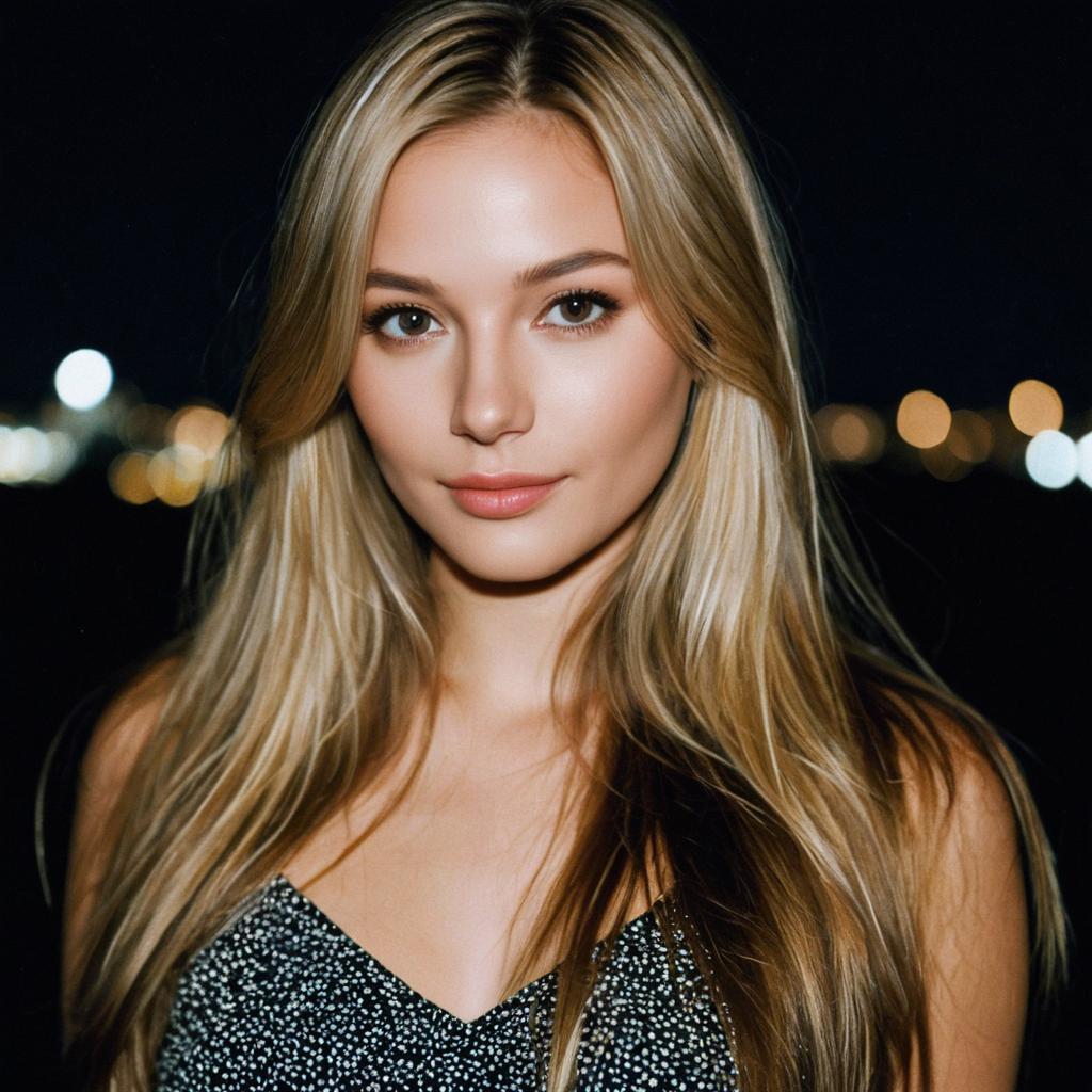 Simple night out outfit,1girl, realistic, dress, long hair, blonde hair, solo, looking at viewer, brown eyes, photorealistic, lips, blurry, brown hair, night