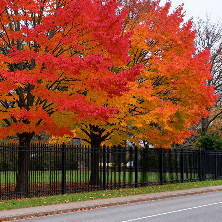 Autumnal trees with vibrant red, orange, and yellow foliage stand majestically behind a sleek black wrought iron fence, casting a serene backdrop over a neatly manicured lawn dotted with fallen leaves along a quiet road.