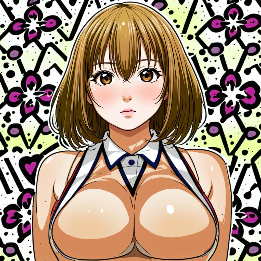 Digital anime illustration of a young woman with short brown hair, brown eyes, and a mole under her eye. She has large breasts and is wearing a sleeveless top with a collar. The background features a decorative, abstract pattern with black and purple floral elements.