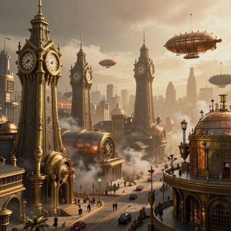 A panoramic vista reminiscent of vintage airbrushed album art captures a vibrant steampunk metropolis at twilight. In this bustling urban landscape, intricately designed clockwork structures and elegant airships dominate the skyline as they bathe in the soft glow of sunset. A daring figure clad in polished copper armor skillfully maneuvers through the maze of whirring gears, steam-puffed pipes, and metallic frameworks on an electric-powered hoverboard. Their path is lit by a trail of pulsating neon-blue light, casting dynamic shadows that dance across the city's mechanical expanse as they navigate its towering heights with audacious grace. The color palette in this scene is richly composed of vivid purples, oranges, and deep blues, which together create an atmosphere charged with excitement and the promise of thrilling adventures amidst the city's intricate clockwork architecture.