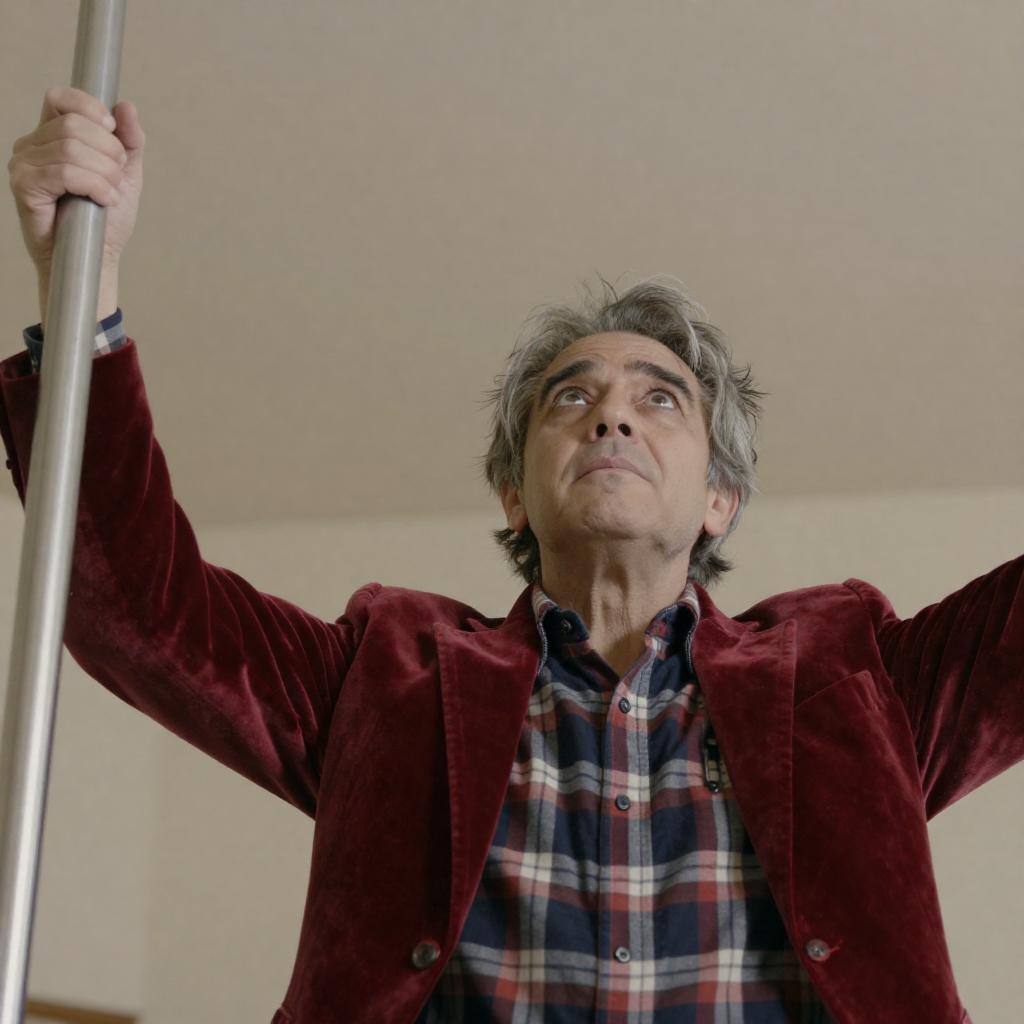 Photograph of a middle-aged man with disheveled grey hair, wearing a red velvet jacket over a plaid shirt, looking up intently. He holds a metal pole in his right hand, arms raised. Ceiling above, beige walls in background.