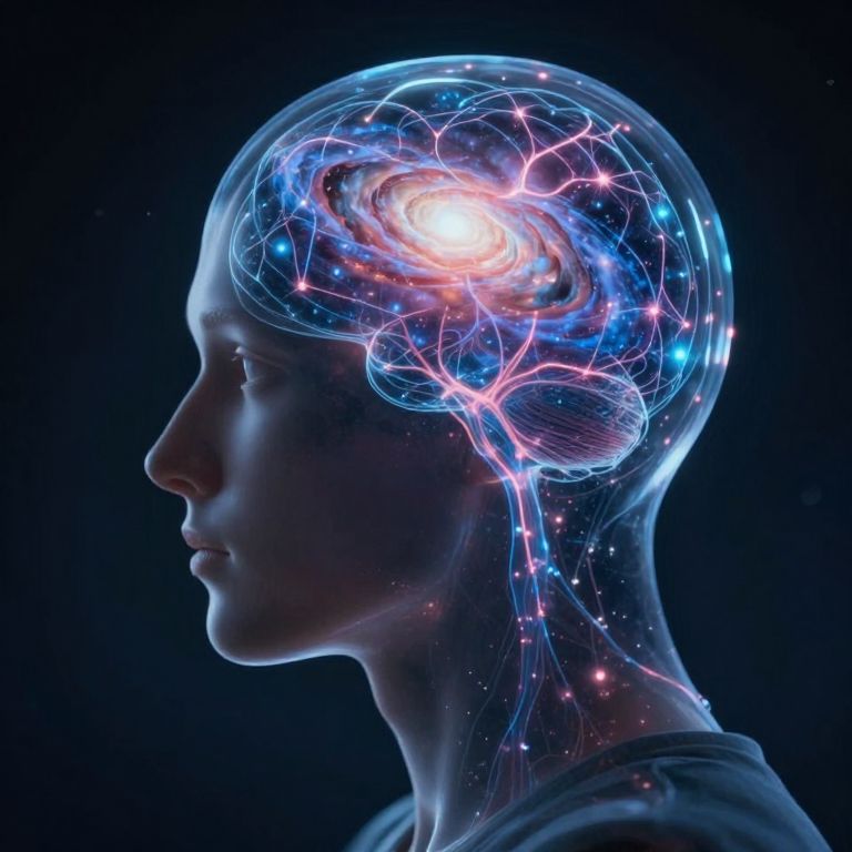 Photographic CGI image of a side profile of a human head against a dark blue-black background. The transparent head reveals a glowing, neon-blue and pink neural network with a bright white core, resembling a spiral galaxy. Light trails and star-like dots connect various parts of the brain, suggesting a complex, interconnected network. The person's silhouette is slightly illuminated, highlighting the smooth contours of the face and neck. The person is wearing a simple, light-colored shirt. The overall aesthetic is futuristic and scientific, emphasizing the complexity of the human brain.