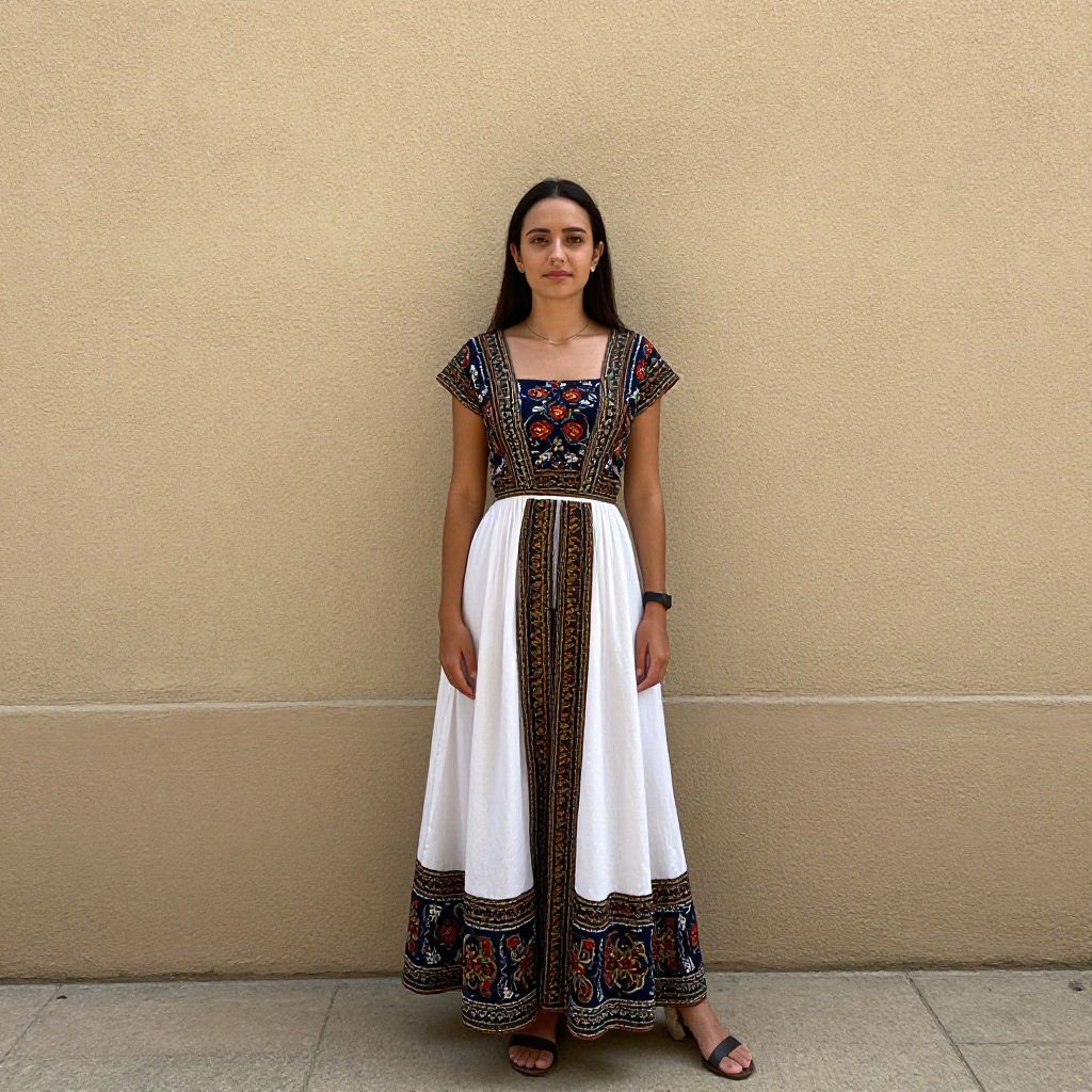 "Trip Dress Woman, woman in a traditional dress standing in front of a wall"