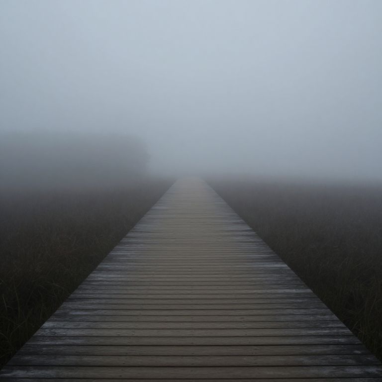 A hushed wooden pathway stretches into the misty void, where silence whispers of solitude and reflection, inviting the soul to traverse the ephemeral divide between presence and absence.
