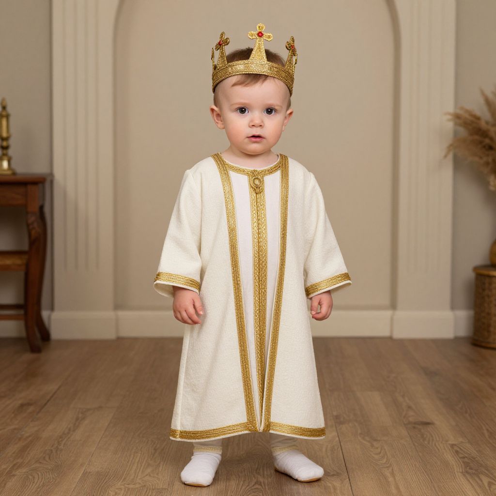 Photograph of a fair-skinned, blonde toddler wearing a white, gold-trimmed royal robe and gold crown, standing on wooden floor in a