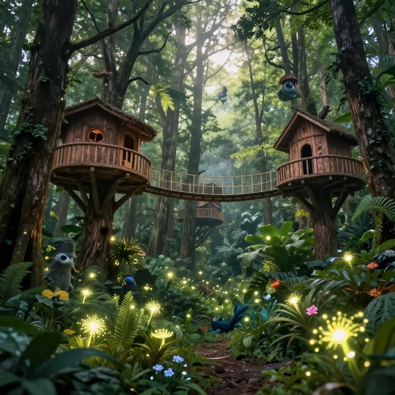 Jr's fantasy forest hideaway, magical glowing plants and flowers, mystical creatures peeking through lush greenery, soft morning light filtering through tall trees, wooden treehouses connected by rope bridges, serene and enchanting environment