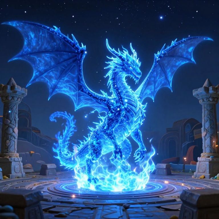 Digital artwork of a glowing blue dragon with fiery wings, standing on a circular, illuminated stone platform in a dark, starry night with ancient stone columns