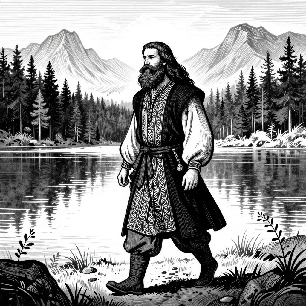 Black and white woodcut-style illustration of a wandering bard with long hair and a full beard. The bard is dressed in traditional, intricately patterned clothing and stands near a tranquil lake with dense forest and mountains in the background. The image features detailed linework and textured artistic effects reminiscent of classic woodcut prints.