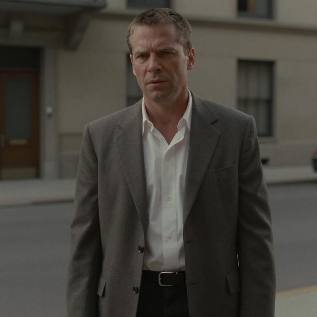 Photograph of a middle-aged Caucasian man with short, dark brown hair, standing on a city street. He has a serious expression and is wearing a slightly disheveled, dark gray suit jacket over a white, slightly unbuttoned dress shirt. The background shows a blurred, beige building with a dark door and window on the left. The street is paved with gray asphalt, and there is a yellow line near the bottom edge. The overall mood is somber and tense. The man's physique is average, and he is centered in the frame.
