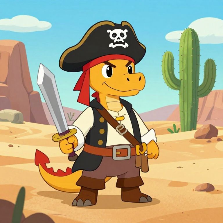 A cartoon dragon dressed as a pirate stands in a desert, holding a sword, with a cactus and rocky ruins in the background.