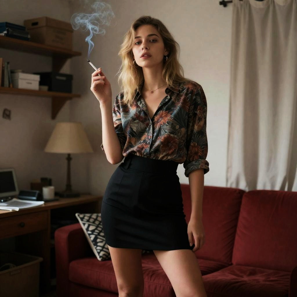 Young woman with blonde hair smoking, wearing vintage-style blouse and high-waisted black skirt, standing in dimly lit, cluttered room. Smoke rises from cigarette in her right hand. Red sofa with black and white patterned pillow in background. Shelves with boxes and a lamp on left. Worn, ured walls and curtains. Casual, confident pose. Soft, natural light.