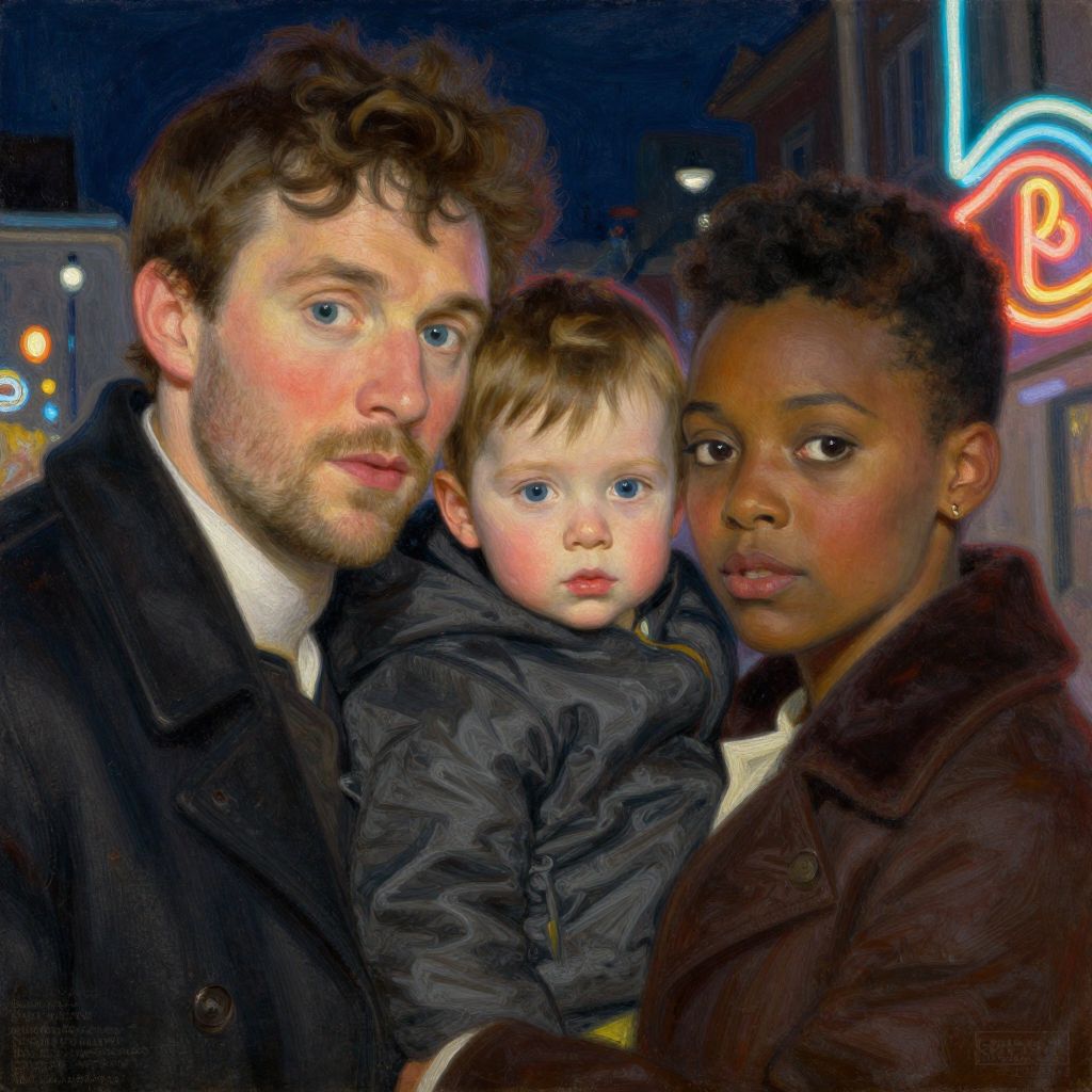 Winter, family, colin farrell with ruth negga with their kid, neon light, detailed faces, painting by gaston bussiere, craig mullins, j. c. leyendecker