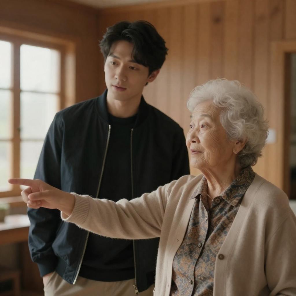Photograph of a grocery store scene. A man with dark hair in a brown coat and a woman with white hair in a black fur coat stand facing each other, examining a bunch of grapes. The background features brightly colored fruits, including red bell peppers, green apples, and yellow bananas, stacked on shelves.