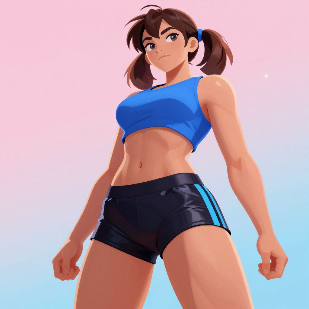 Stylized digital artwork of a young athletic woman with brown hair styled in pigtails, wearing a blue crop top and shiny black shorts with blue stripes. The perspective is low-angle, emphasizing her toned abs and muscular legs. The background features a gradient of soft pink and blue with subtle light particles.