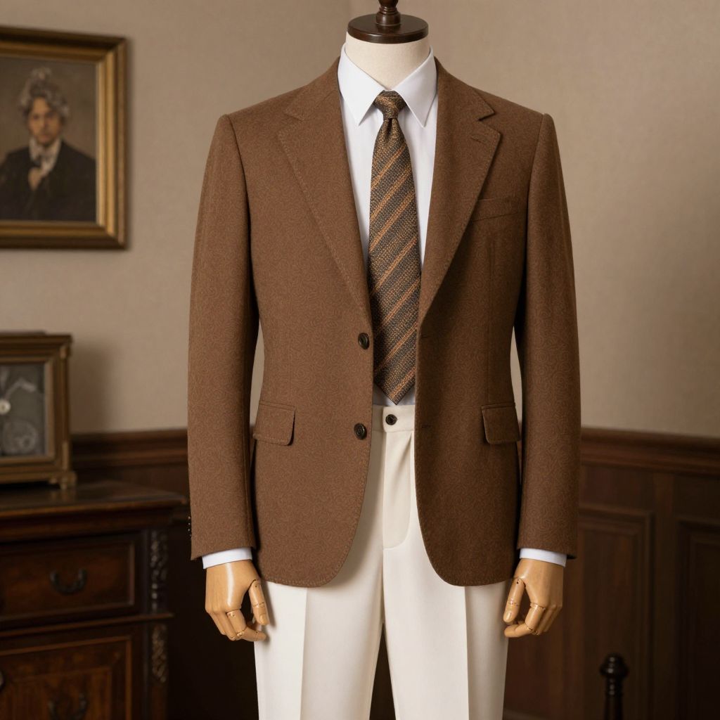 Photograph of a mannequin displaying a brown tweed blazer with black buttons, over a white dress shirt, and a dark brown patterned tie. The mannequin also wears white pants. The background features a framed portrait of an older man with grey hair, and a dark wooden cabinet with a clock on the left. The wall behind is beige with dark wood wainscoting. The lighting is soft, highlighting the textures of the tweed and the crispness of the white pants. The overall style is formal and classic.