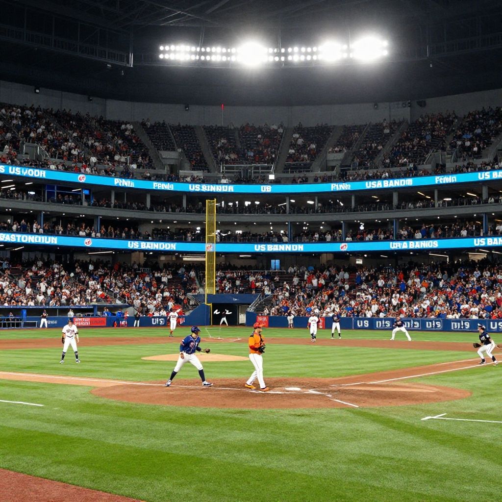 US Bank Stadium baseball game packed with fans, vibrant energetic atmosphere, bright stadium lights, dynamic players in action, vivid colors, hyper-realistic sports photography style