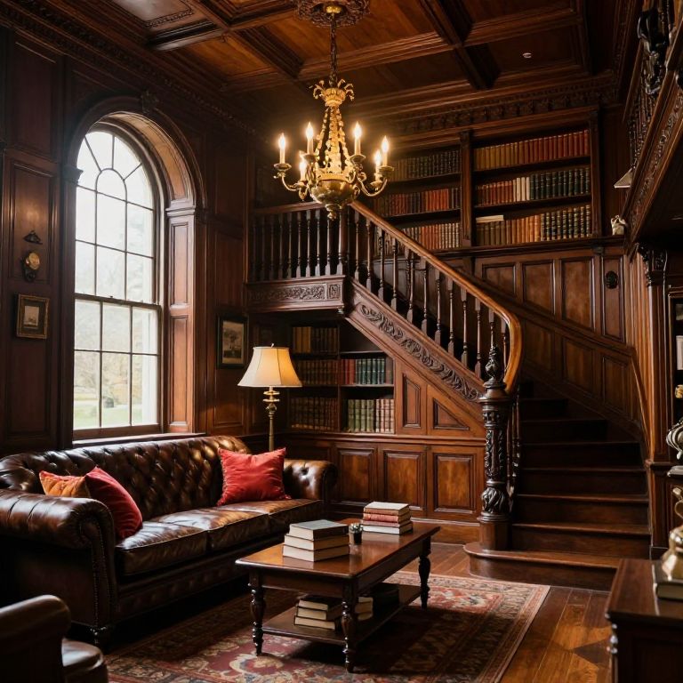 The image depicts the interior of a grand, wood-paneled library within an old Victorian mansion, reminiscent of Anne Stokes' style. The scene is bathed in warm, cinematic lighting that enhances the rich, dark wood tones of the paneling and furniture. A plush, leather-upholstered sofa adorned with vibrant cushions sits invitingly to the left, while a stack of books rests on a wooden coffee table in the center. The library is illuminated by a chandelier hanging from the coffered ceiling, casting a soft glow that accentuates the intricate carvings and architectural details. Large, arched windows allow natural light to filter in, creating a cozy atmosphere. To the right, a grand staircase ascends, its wooden balustrade adorned with ornate carvings. The overall composition is balanced, with objects and architectural elements arranged in a harmonious manner, creating a sense of depth and space. The interplay of warm colors and textures, from the rich wood to the plush upholstery, contributes to the luxurious and timeless feel of the setting.