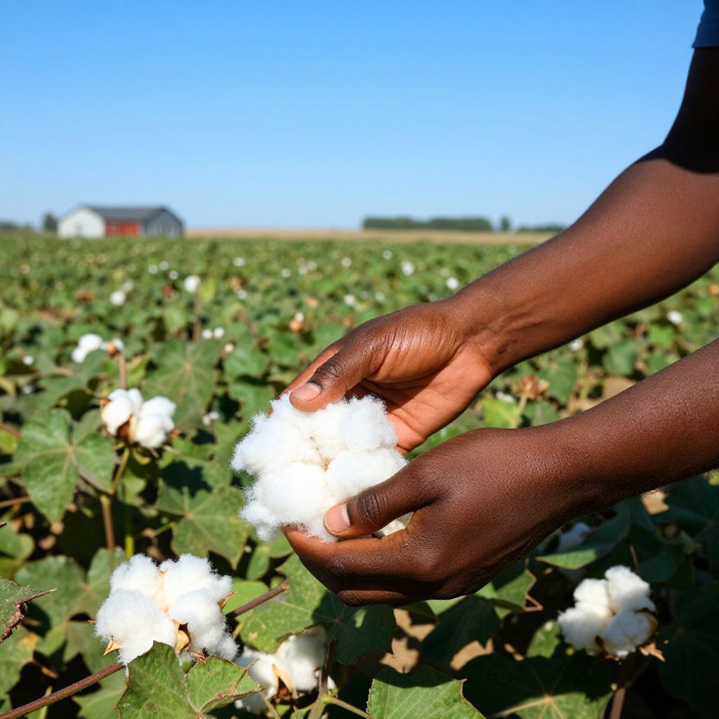 Black man picking cotton under a bright blue sky, surrounded by rows of lush green cotton plants, vibrant rural landscape with distant farmhouse, focus on hands delicately handling white cotton bolls, natural lighting emphasizing texture and depth.