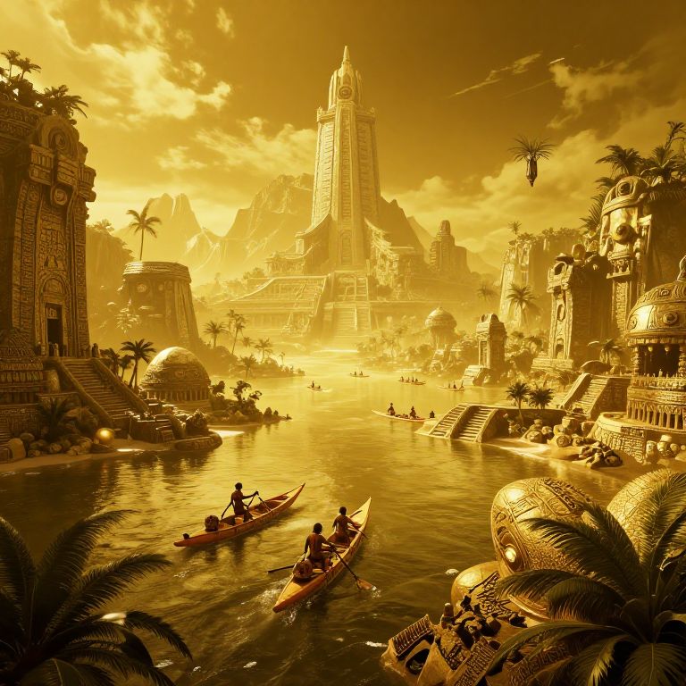 Cyberpunk Game Mayan adventurers in pirogues discovering a wild archipelago, nothing is built on the island, wild landscape covered with gold,