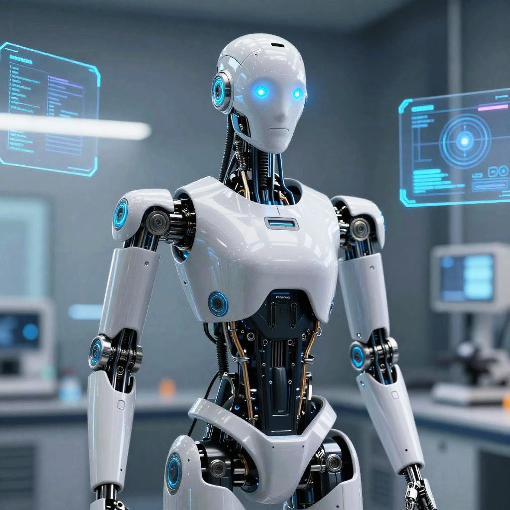 F222 ai advanced robot with metallic limbs and glowing blue eyes in a high-tech laboratory, surrounded by floating transparent screens, detailed cybernetic textures