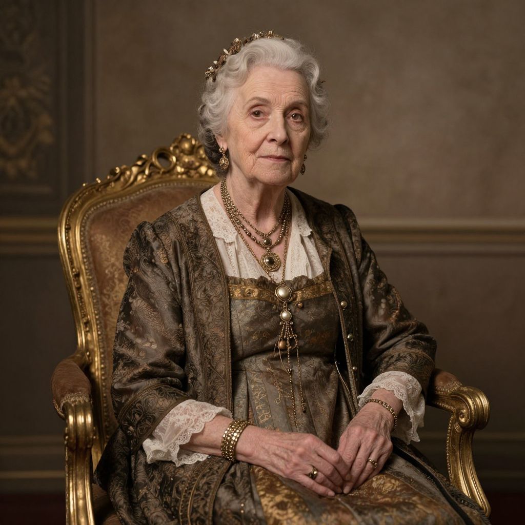 Portrait of an elderly woman dressed in elaborate vintage clothing and intricate gold jewelry, seated gracefully on a regal, ornate chair with a decorative golden frame. The setting and style evoke a classical portraiture aesthetic, highlighting timeless elegance and historic charm.