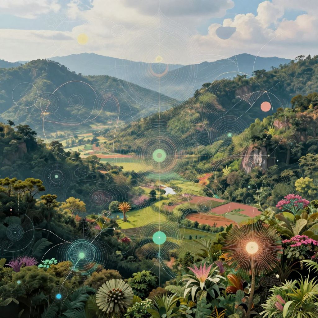 AI art design portraying a vivid dreamscape where AI-generated motifs merge with natural landscapes, ethereal color palettes, intricate geometric forms overlaying organic textures, evoking harmony between nature and technology, photorealistic style.