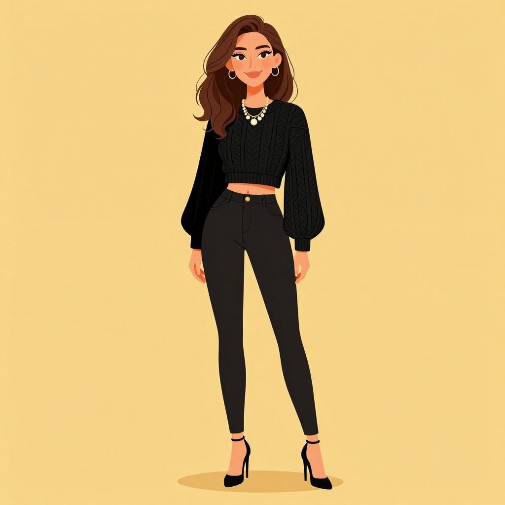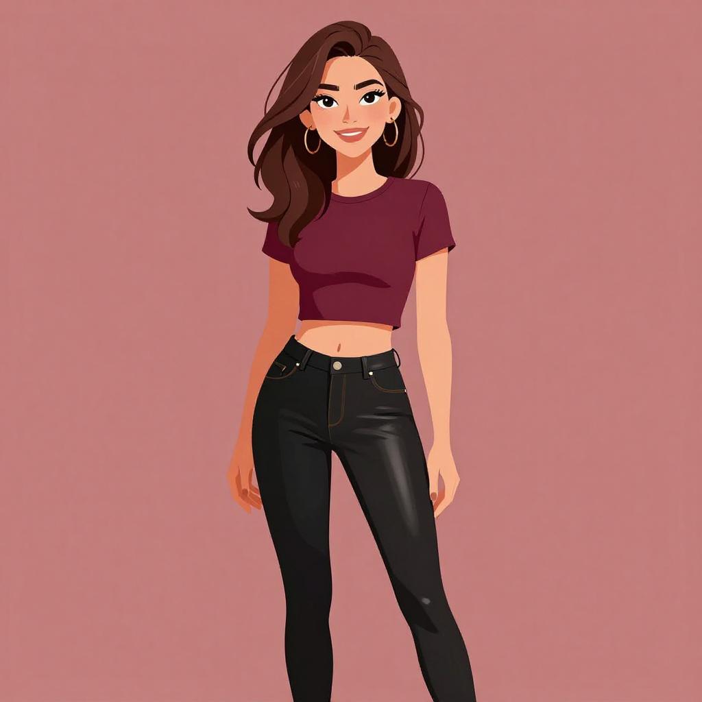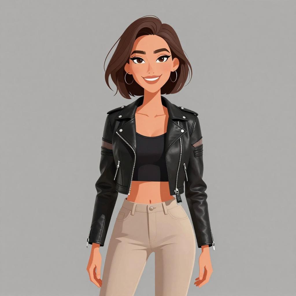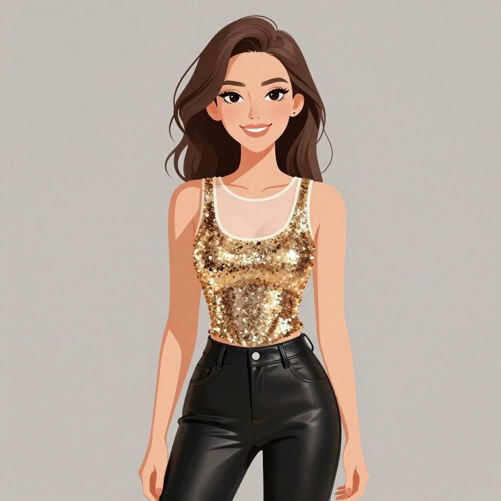 Woman with pretty face and pretty hair. smiling Woman, chic, metallic gold sequined tank top with sheer white neckline panel, scoop neckline, fitted silhouette, paired with black faux-leather pants, skinny fit, mid-rise. --sref 1467