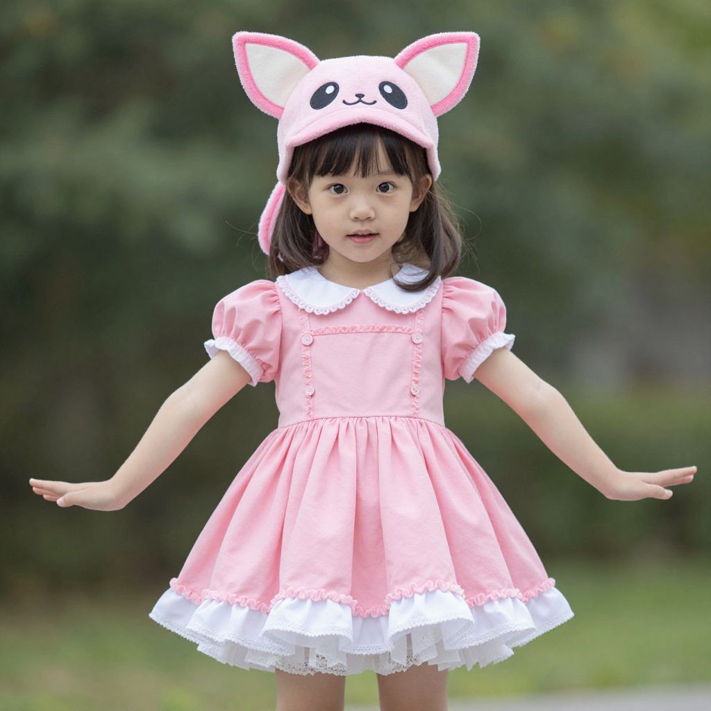 Photograph of an Asian girl with black hair, wearing a pink cat-eared hat and pink dress with white lace trim, standing outdoors with arms out