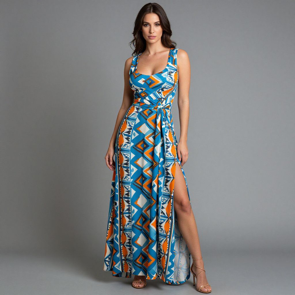 "Woman, vibrant, sleeveless maxi dress with bold geometric patterns in blue, orange, and white, scoop neckline, cinched waist, light draping fabric, side slits, strappy heeled sandals.. Sexy. Pretty face and beаutiful eyes. Big breasts."
