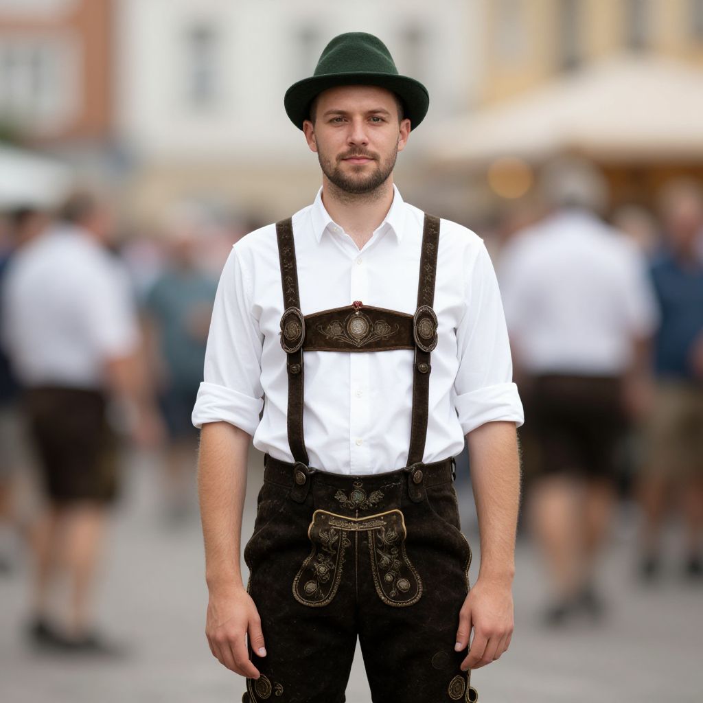 Photograph of a young man with light skin, brown hair, and beard, wearing a green hat, white shirt, black lederhosen,