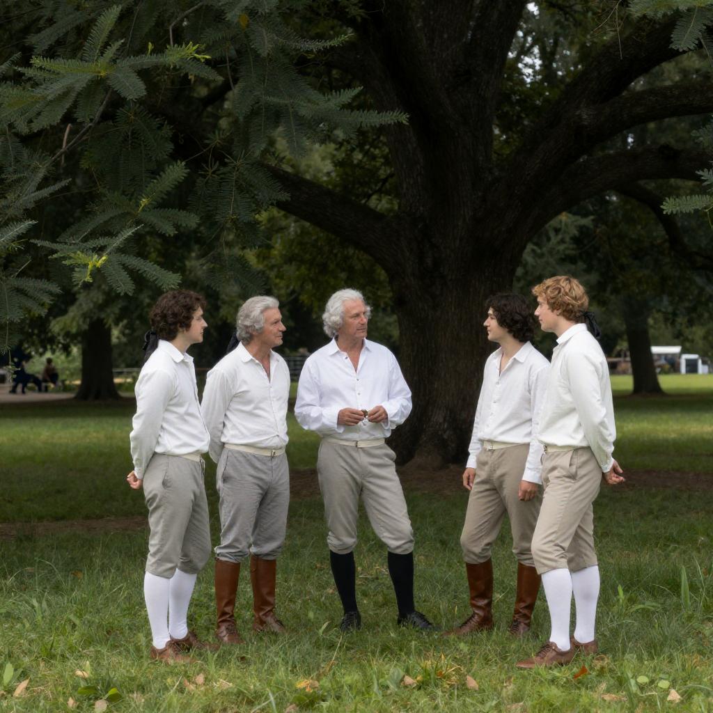 Photograph of five people in 18th-century attire standing in a grassy park with a large, dark tree in the background. They wear white shirts, gray pants, and brown boots. Three individuals are on the left, two on the right, with one person holding a small object. Sunlight filters through the tree's leaves.