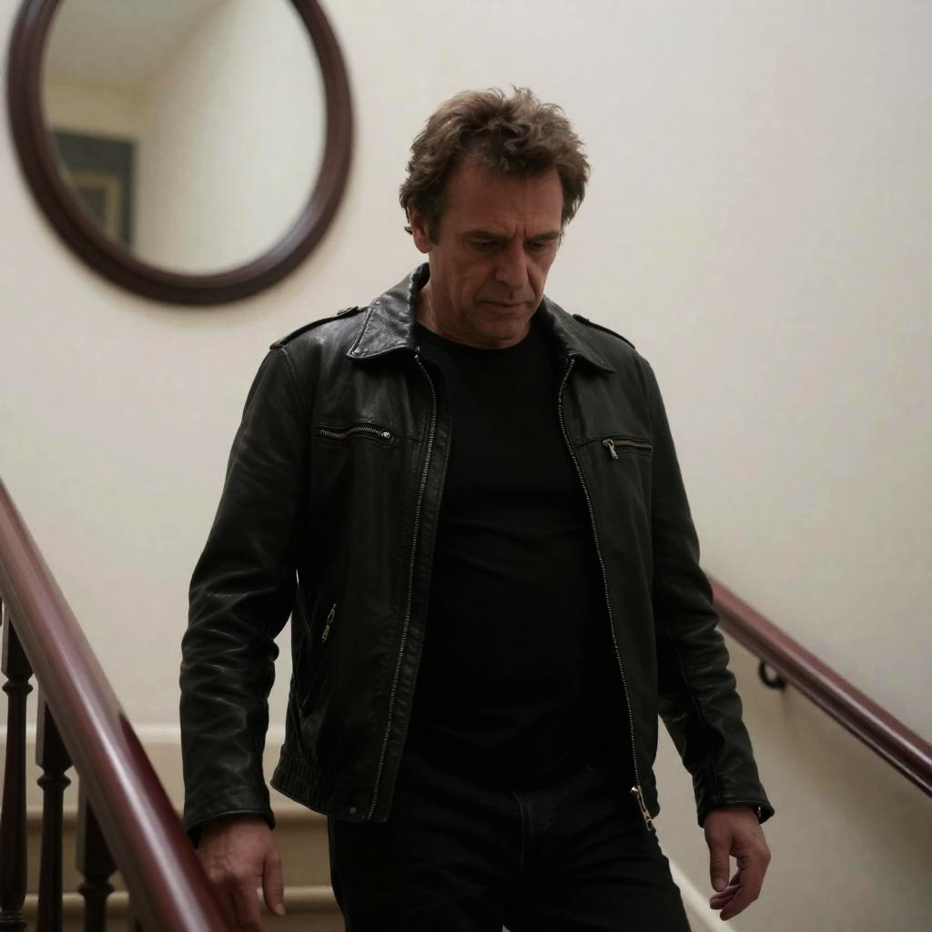 Middle-aged man in black jacket and beige pants, intense expression, raises left leg, kicking seated person with raised foot. Seated person, legs up, head down, wearing dark pants. Red-clothed table, black chairs, flower vase, map on brown wall. Restaurant setting.