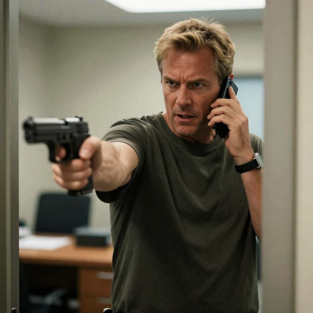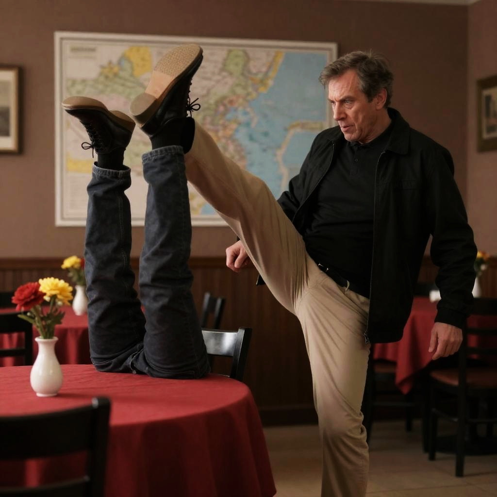 A middle-aged man wearing a black jacket and beige pants with an intense expression raises his left leg to kick another individual seated at a table. The seated person is wearing dark pants with legs raised and head down. The scene is set in a restaurant with red tablecloths, black chairs, flower vases, and a map on the brown wall.