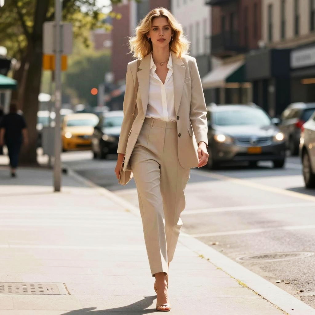 Blonde pants, stylish woman walking through a sunny city street, soft natural lighting, vibrant urban background, high fashion editorial style