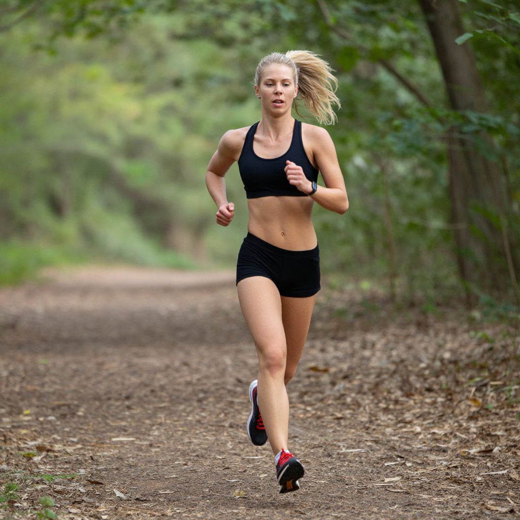 Photograph of a fit, blonde woman jogging on a forest path. She's wearing a black sports bra and black shorts, with red and black running shoes. Her hair is flying back as she runs. The path is covered in brown leaves, and the background is filled with green trees and sunlight filtering through the leaves. She looks focused and determined.