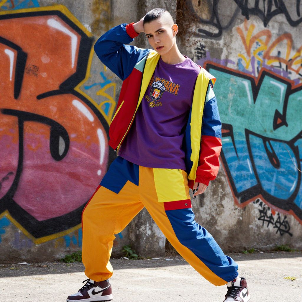 Photograph of a young man with a shaved head, standing in a graffiti-covered urban alley. He wears a colorful, oversized jacket with red, blue, and yellow panels, a purple sports shirt with yellow and red text, and bright yellow pants with blue and red stripes. Black sneakers with white soles complete his outfit. He strikes a confident pose, one hand on his head, the other on his hip, with a serious expression. The background features large, colorful graffiti tags in orange, blue, and green on a weathered concrete wall. Bright sunlight casts sharp shadows.