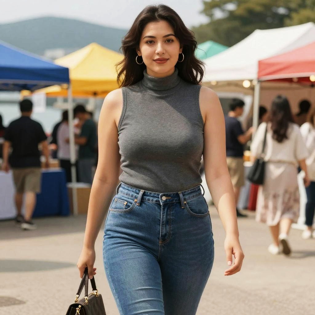 A Curvy woman, casual chic in high-waisted skinny jeans and a charcoal gray sleeveless turtleneck, stands at a waterfront festival with colorful tents, embodying the vibrant and whimsical style of Kyoto Animation. Sexy. Pretty face and beutiful eyes