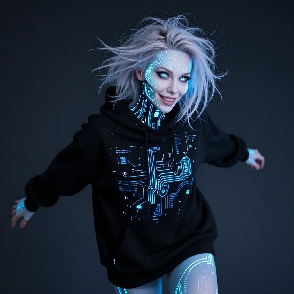 She moves with an eerie, fluid grace, Chiaroscuro Lighting Style, an ethereal blend of organic beauty and advanced technology, Her glowing, cyborg skin pulses with electric blue lines, shifting like the circuitry of a living neural network, With every step, the intricate patterns on her face seem to shift, her hollow eyes glowing with an unsettling, all-knowing aura, as if she is seeing beyond the physical realm, The deep gradient of her skin—from white to pale blue—glows softly, flickering with subtle digital glitches that suggest an intelligence far beyond human, A trace of humanity lingers in her, an unexpected contrast, partially covered in shadows, The faintest hint of a rugged, slightly muscular form can be seen beneath the smooth, digital surface, like a shadow of a man interwoven with her cybernetic being, Her hair, a tangle of static-like strands, falls loosely over her glowing face, revealing one sharp, piercing eye that gleams with intensity and mischief, A sly grin plays across her lips, an intriguing mix of charm and danger, The soft monitor light that casts across her creates a haunting ambiance, highlighting the fusion of organic and technological textures, Her attire—an oversized vintage black hoodie paired with sleek, glowing elements—blends seamlessly with the sophisticated yet raw energy of her presence, Each movement is deliberate, a perfect harmony of man and machine, captivating in its unsettling beauty and unreachable depth