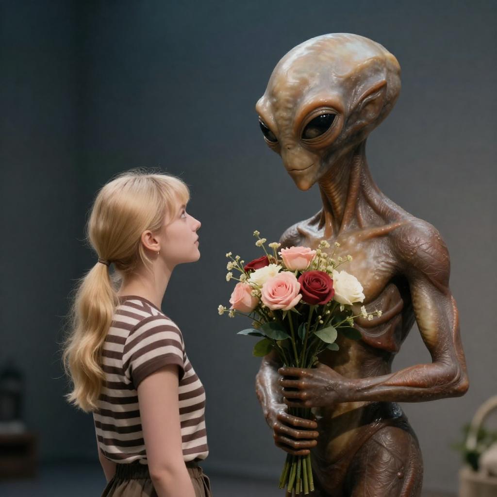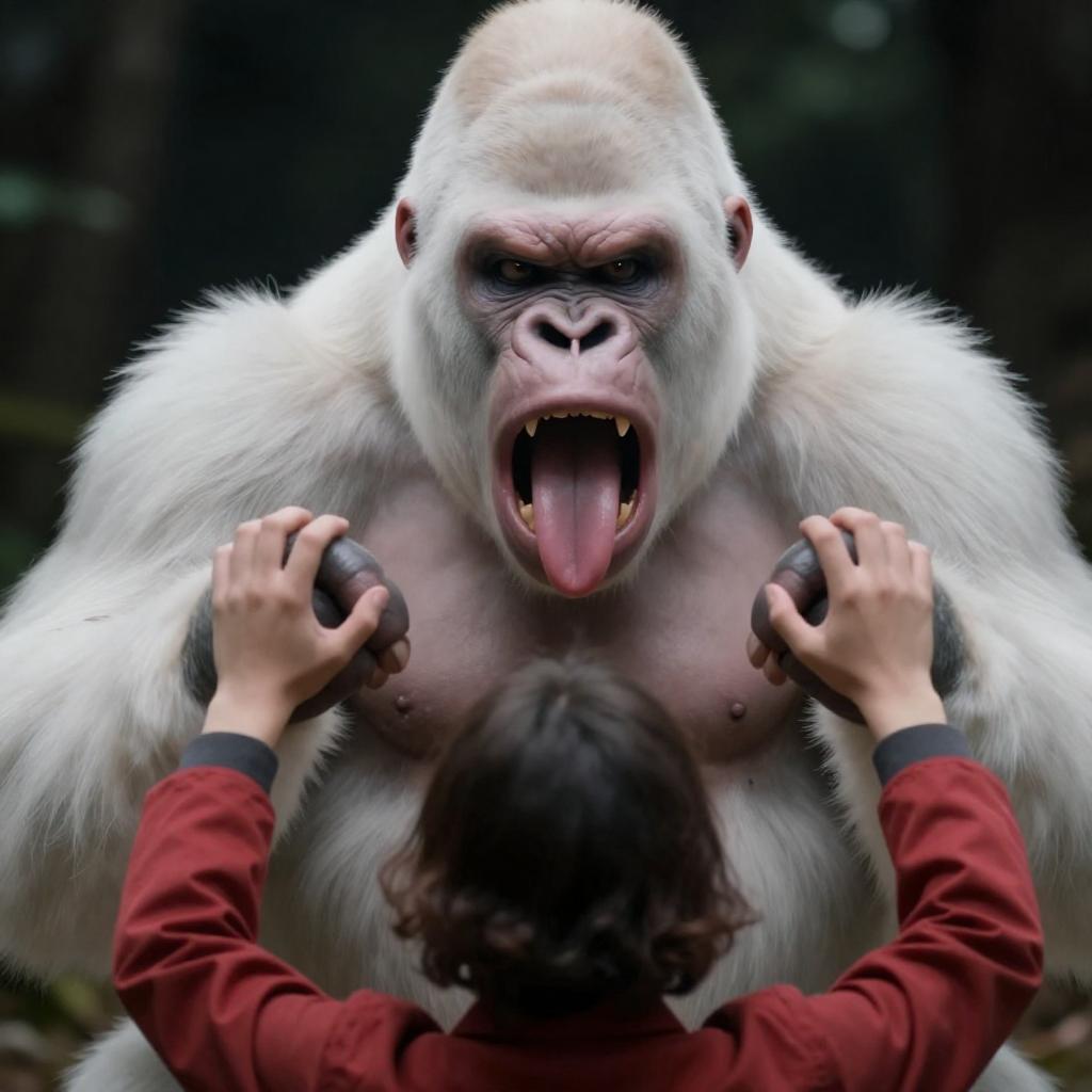 Photograph of a dark, furry, monkey-like creature with a menacing expression, standing on a blonde woman's back. The woman is nude, lying face down on a bed with white sheets. The background features patterned wallpaper and a lit mirror. The scene is dimly lit with a red-orange hue, creating a dramatic, intense atmosphere.