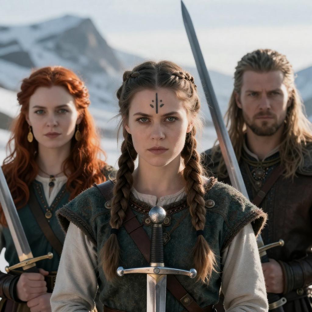 Photograph of five fantasy warriors in a ruined, medieval castle. Elder bearded man with green robe and staff on left, three archers in green and black attire with bows, standing and crouching, on right. Fourth character with long hair and fur-trimmed coat, holding sword. Background: destroyed wooden structures, overcast sky. All warriors with intense expressions, facing forward.