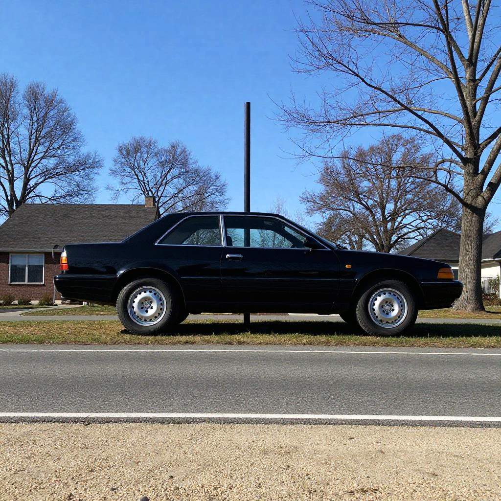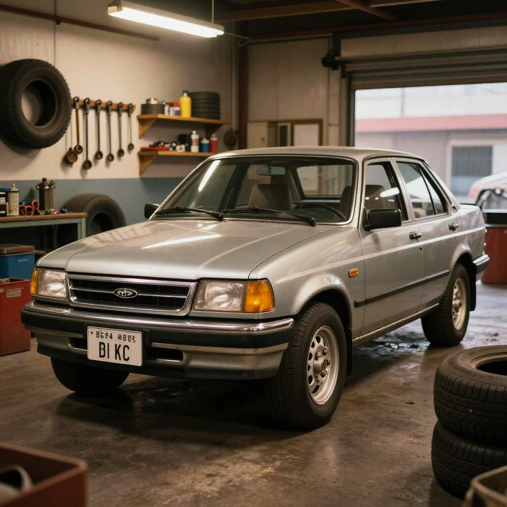 1990 Ford Fusion in a retro mechanic garage, tools and tires around, warm lighting, realistic details, nostalgic 90s atmosphere