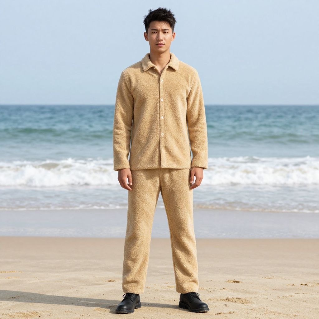 Photograph of an Asian man standing on a sandy beach with the ocean in the background. He has short, black, spiky hair and a neutral expression. He is wearing a light beige, textured, long-sleeve button-up jacket and matching trousers, with black shoes. The sky is clear and blue, and the waves are gently crashing onto the shore. The man is centered in the frame, standing with his hands by his sides. The beach is mostly empty, with no other objects or people visible.