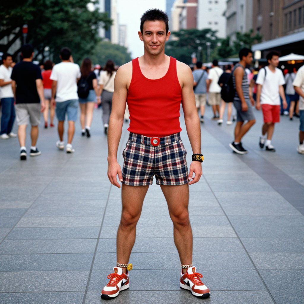 A man, bold red tank top, plaid flannel shorts, retro-style basketball shoes, woven fabric anklet, urban plaza, bustling crowds, AgfaColor film, confident smile, vibrant energy. Man has masculine face and piercing eyes