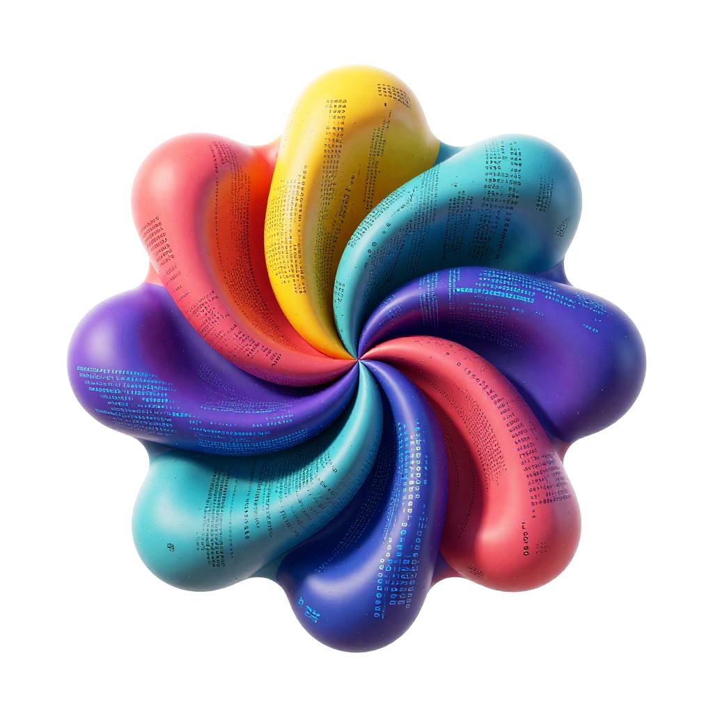 Colorful abstract digital artwork featuring organic swirling shapes made from fragmented code elements. Vibrant rainbow hues with high contrast and intricate details on a transparent background, representing futuristic AI and technology concepts.