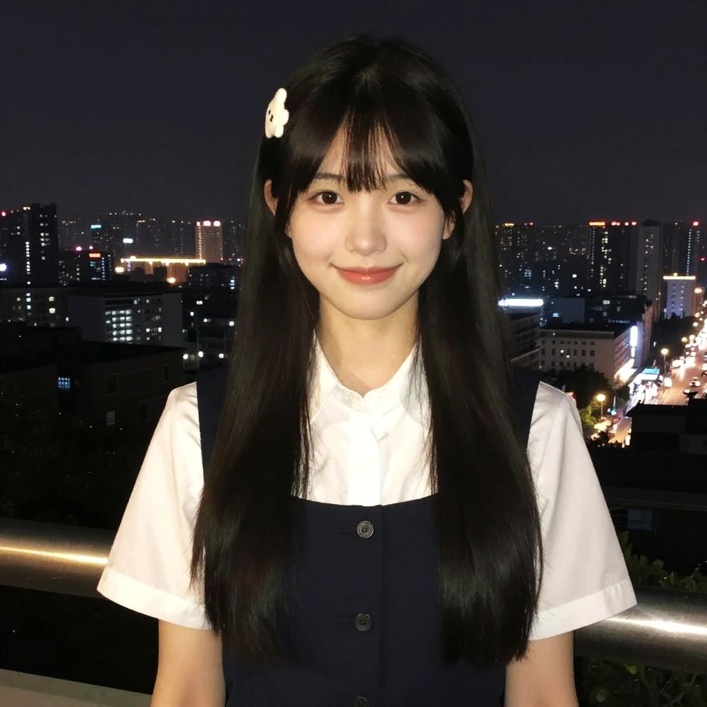Chunmomo, 1girl, solo, realistic, smile, looking at viewer, blurry, black eyes, black hair, bangs, long hair, day, blunt bangs, hair ornament, cityscape, night, school uniform, corset