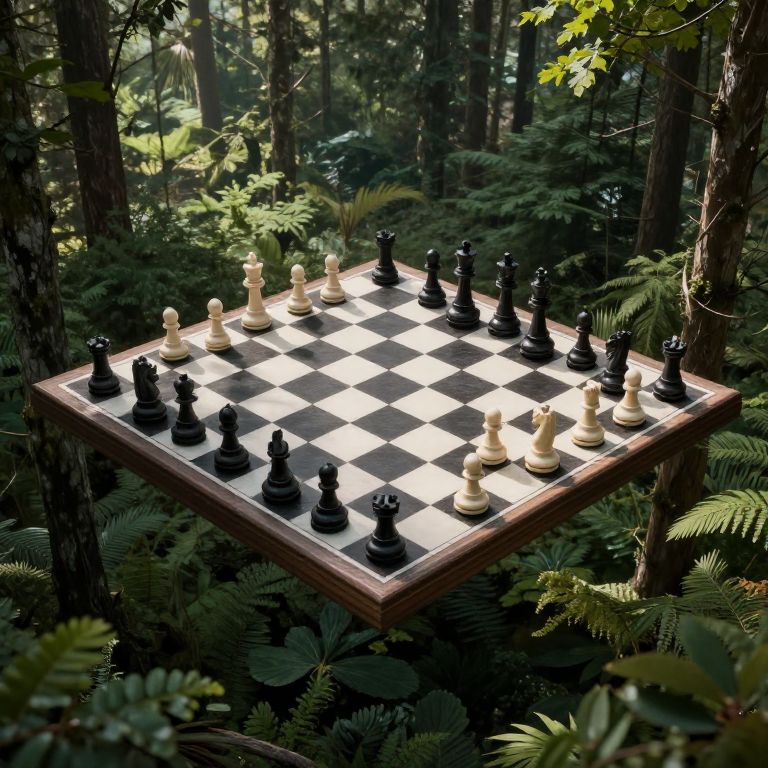 A colossal chessboard floats serenely above a dense forest, its black and white squares casting shadows over the treetops, while the silhouettes of dark chess pieces stand poised against the misty green backdrop.