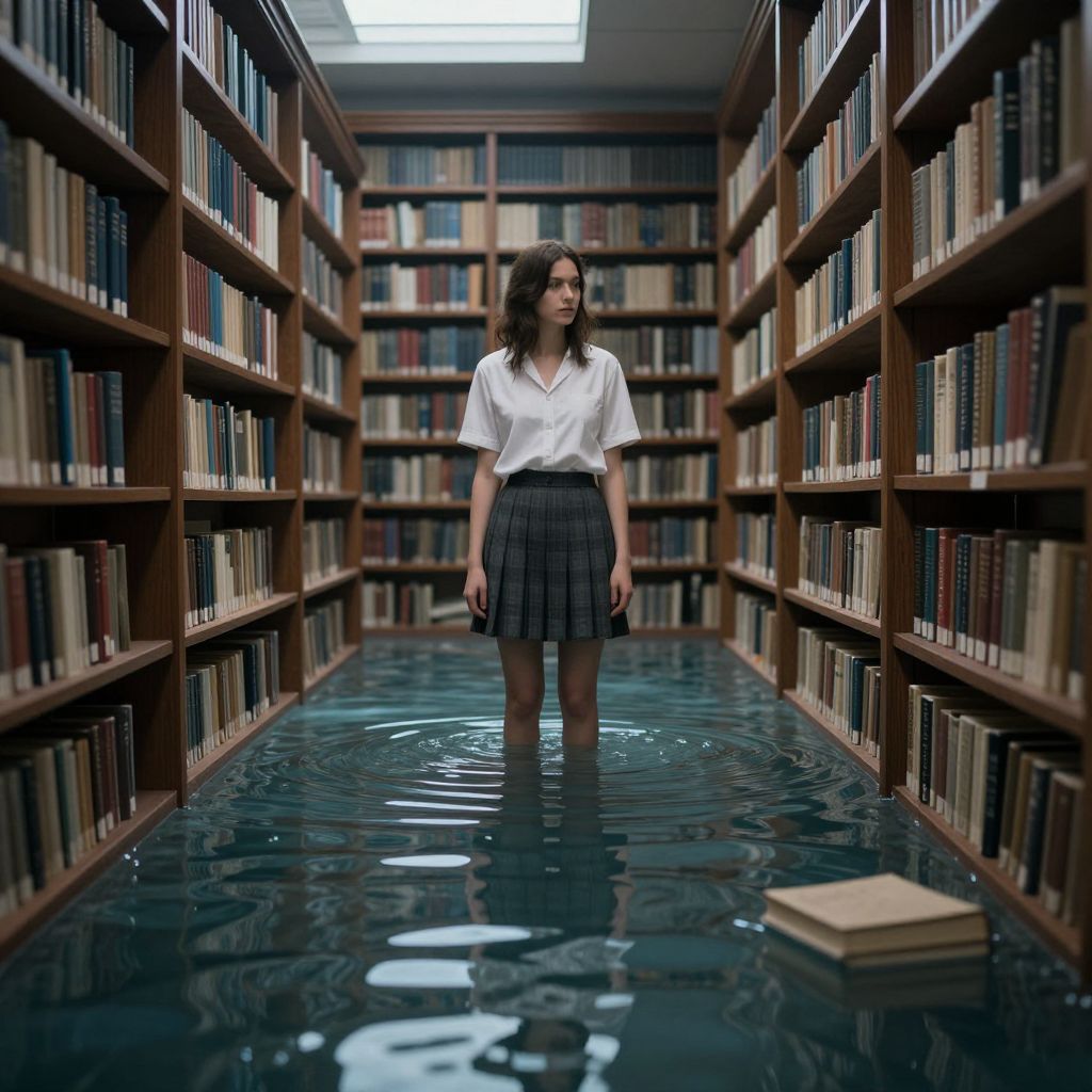 Photograph: Young woman with wet, wavy brown hair, white blouse, and gray pleated skirt standing in flooded library aisle, surrounded by tall